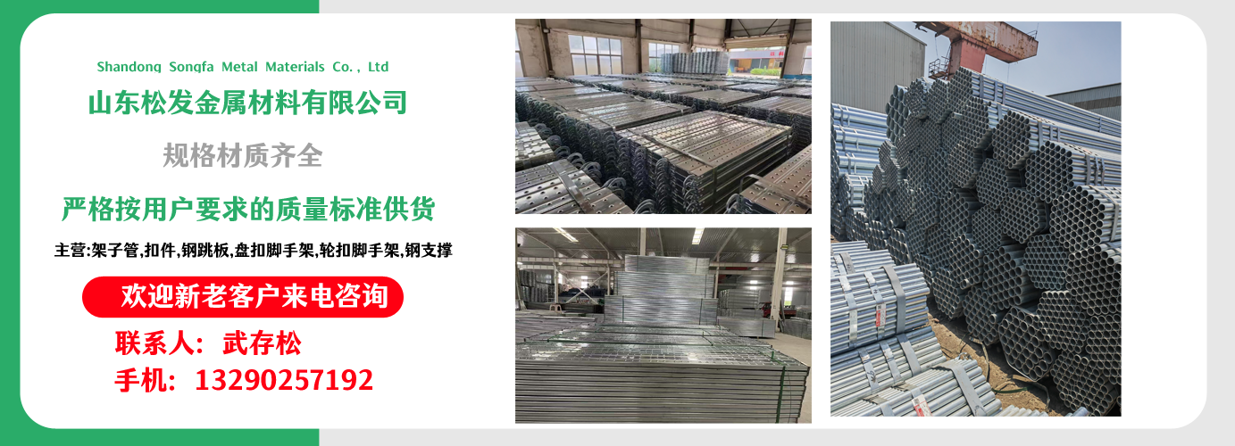 山東松發(fā)金屬材料有限公司主營架子管,扣件,鋼跳板,盤扣腳手架,輪扣腳手架,鋼支撐生產(chǎn)廠家。本廠專業(yè)生產(chǎn)銷售。 建筑用架子管、 主要用于房建,橋梁,鐵路,公路,地鐵,水庫,隧道,支撐。 架子管,扣件,鋼跳板,盤扣腳手架,輪扣腳手架,鋼支撐的優(yōu)越性及應(yīng)用“ ”產(chǎn)品因具有結(jié)構(gòu)簡單合理、設(shè)計巧妙、使用方便、安全、快捷、易于運輸、儲存、維護(hù)簡單等特點。 公司一貫堅持“質(zhì)量,用戶至上,優(yōu)質(zhì)服務(wù),信守合同”的宗旨,憑借著高質(zhì)量的產(chǎn)品,良好的信譽(yù),優(yōu)質(zhì)的服務(wù),產(chǎn)品暢銷全球。歡迎廣大客戶來電洽談,共同發(fā)展,共創(chuàng)輝煌! 山東松發(fā)金屬材料有限公司秉承誠信服務(wù)、恪守信譽(yù)的宗旨,在同等的質(zhì)量下,保證以最低的價格,最完善的服務(wù),最高的信譽(yù)來答謝各界朋友的支持和厚愛,歡迎您的來電、咨詢,我們將竭誠為您服務(wù)!...